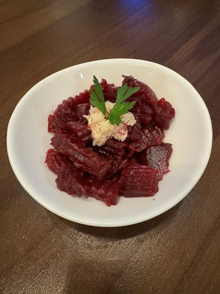 Carne de vită, cartofi, ceapă, ardei gras, maioneză, ou